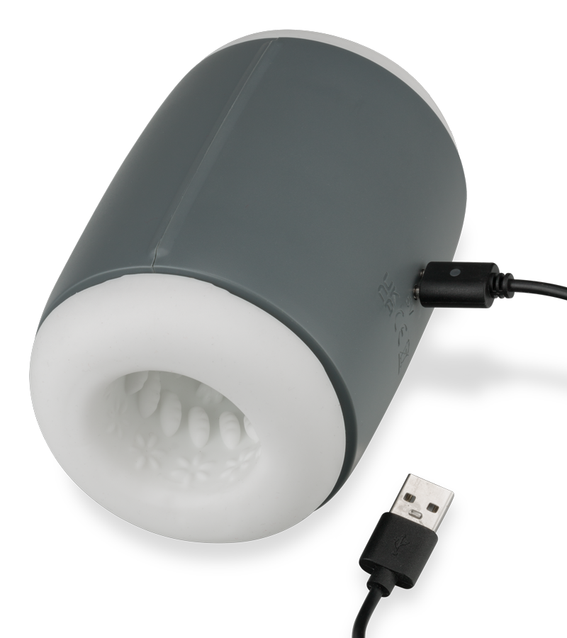 The masturbator's case measures 5.75 inches in length and 3.50 inches in diameter. The masturbator itself measures 4.50 inches in length and 3.25 inches in diameter, with an internal diameter of 1.75 inches. A magnetic USB cable is included for recharging the masturbator's battery and powering the heating function of the case.