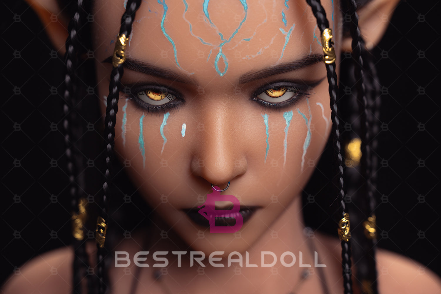1. Sia is an amazing 157cm sex doll with pointy fairy ears. Her appearance is different from other normal sex dolls. the dreadlocks on her head and the hand-painted patterns on her face add a feeling of mystery to her.